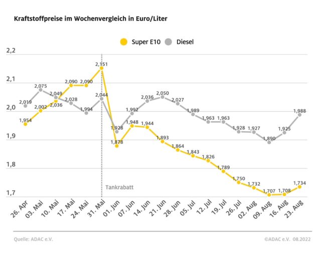 München (ots) – Eine Woche vor dem Auslaufen des Tankrabatts verzeichnet der ADAC im Wochenvergleich einen spürbaren Anstieg der Preise an den Zapfsäulen. Dies macht sich vor allem beim Diesel bemerkbar, der wieder an der Zwei-Euro-Grenze kratzt. Diesel kostet demnach im bundesweiten Mittel 1,988 Euro, was einem Anstieg von 6,3 Cent im Vergleich zur Vorwoche…
