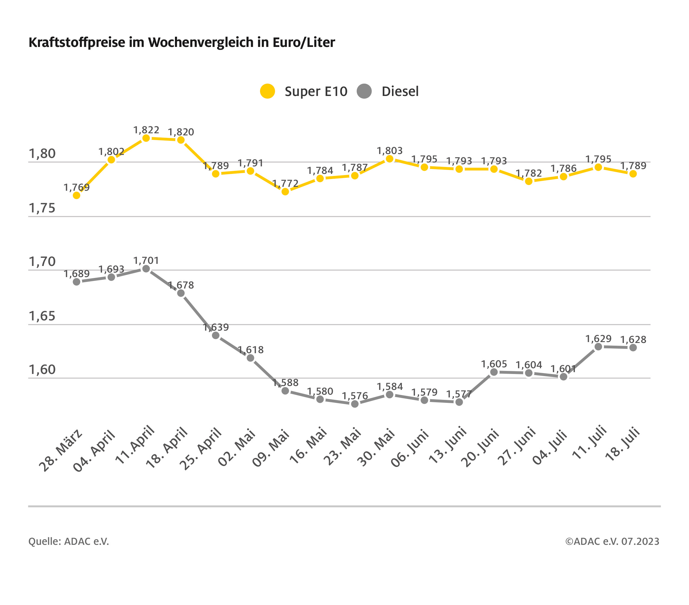 München (ots) – Die Kraftstoffpreise an den deutschen Tankstellen bewegen sich weiterhin kaum von der Stelle. Vor allem der Tagesdurchschnittspreis für Super E10 ist seit Wochen relativ stabil und pendelt dabei knapp unterhalb der Marke von 1,80 Euro. Laut aktueller ADAC Auswertung der Kraftstoffpreise in Deutschland kostet ein Liter Super E10 im bundesweiten Mittel 1,789 Euro, das sind 0,6 Cent weniger als vor Wochenfrist.