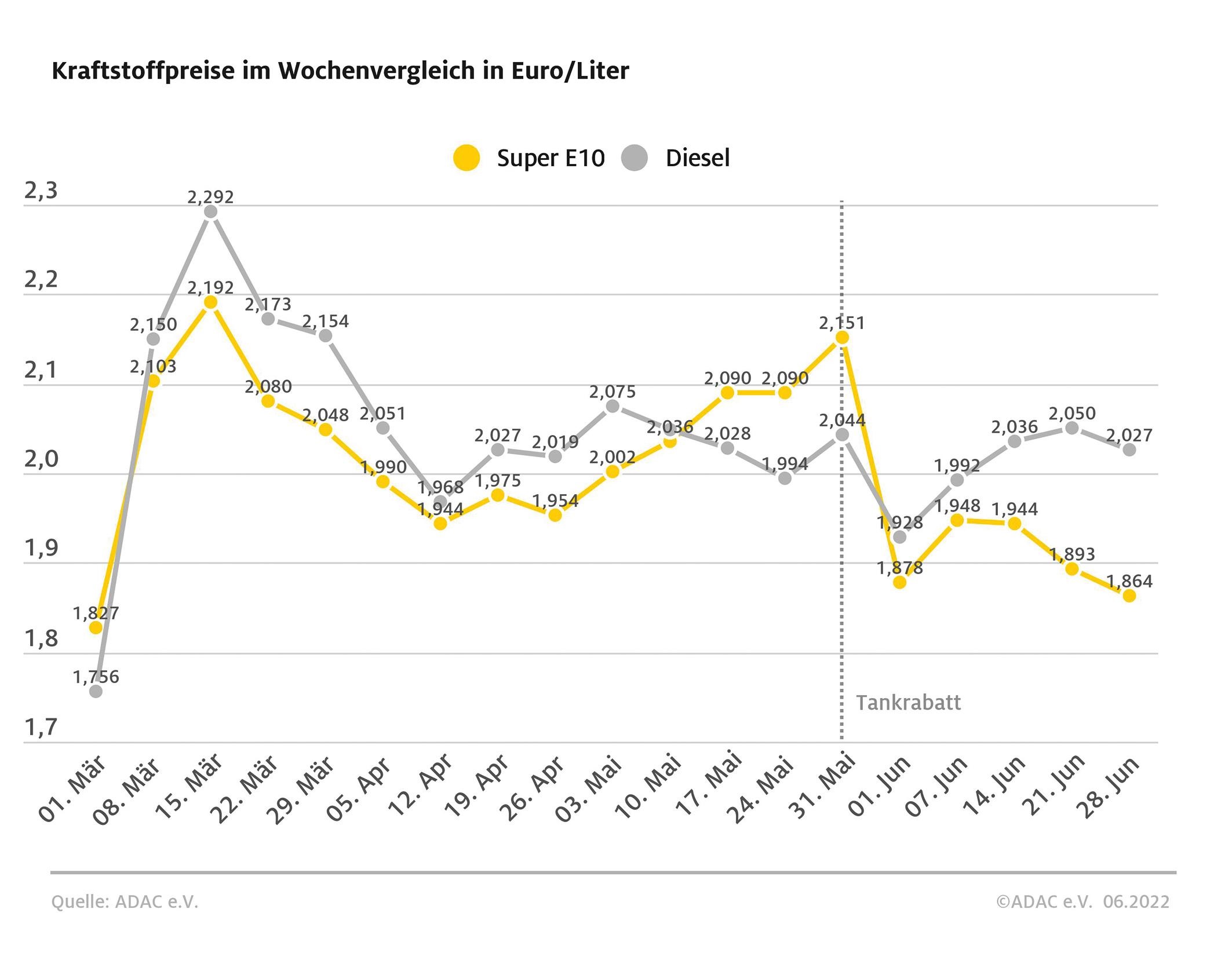München (ots) – Die Kraftstoffpreise in Deutschland sind im Vergleich zur vergangenen Woche gesunken. Wie die aktuelle ADAC Auswertung der Kraftstoffpreise zeigt, kostet ein Liter Super E10 derzeit im bundesweiten Mittel 1,864 Euro, das sind 2,9 Cent weniger als vor Wochenfrist. Der Preis für Diesel ist um 2,3 Cent niedriger und liegt aktuell bei 2,027 Euro.