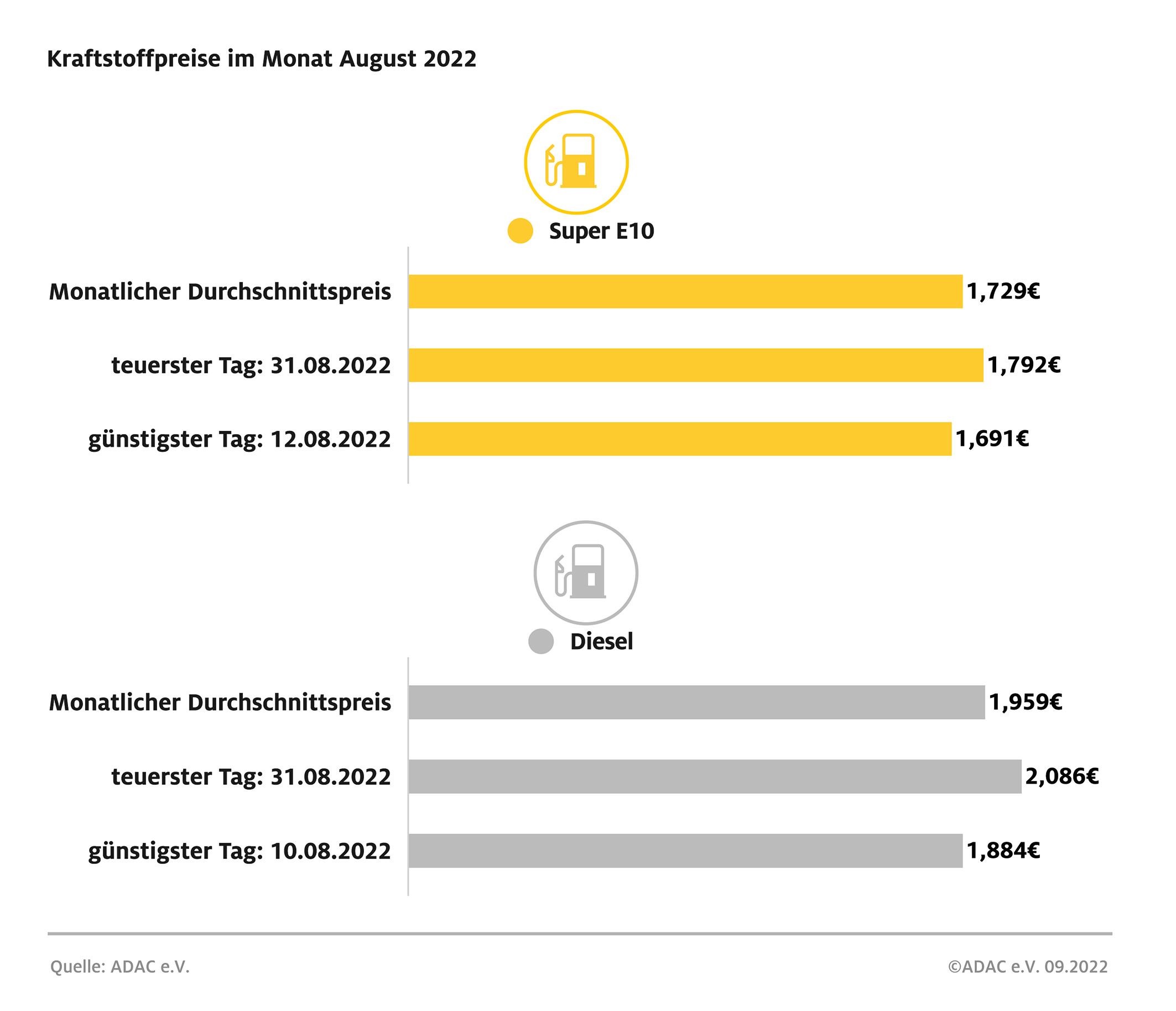 München (ots) – Der teuerste Tag zum Tanken im August war für beide Sorten der letzte Tag des Monats. Bereits zwei Wochen vor dem Auslaufen des Tankrabatts stiegen die Preise seit Monatsmitte kontinuierlich an und fanden am 31. August ihren Höhepunkt mit 1,792 Euro für den Liter Super E10 und 2,086 Euro je Liter Diesel. Deutlich günstiger waren die Spritpreise noch kurz vor Monatsmitte. Für Super E10 mussten Autofahrer am 12. des Monats mit 1,691 Euro je Liter am wenigsten bezahlen. Diesel war am 10. August mit 1,884 Euro je Liter am günstigsten. Der deutliche Anstieg von rund 10 Cent bei Super E10 und von gut 20 Cent bei Diesel vom günstigsten auf den teuersten Tag im August dürfte auch mit dem Auslaufen der steuerlichen Vergünstigungen auf Sprit zusammenhängen.