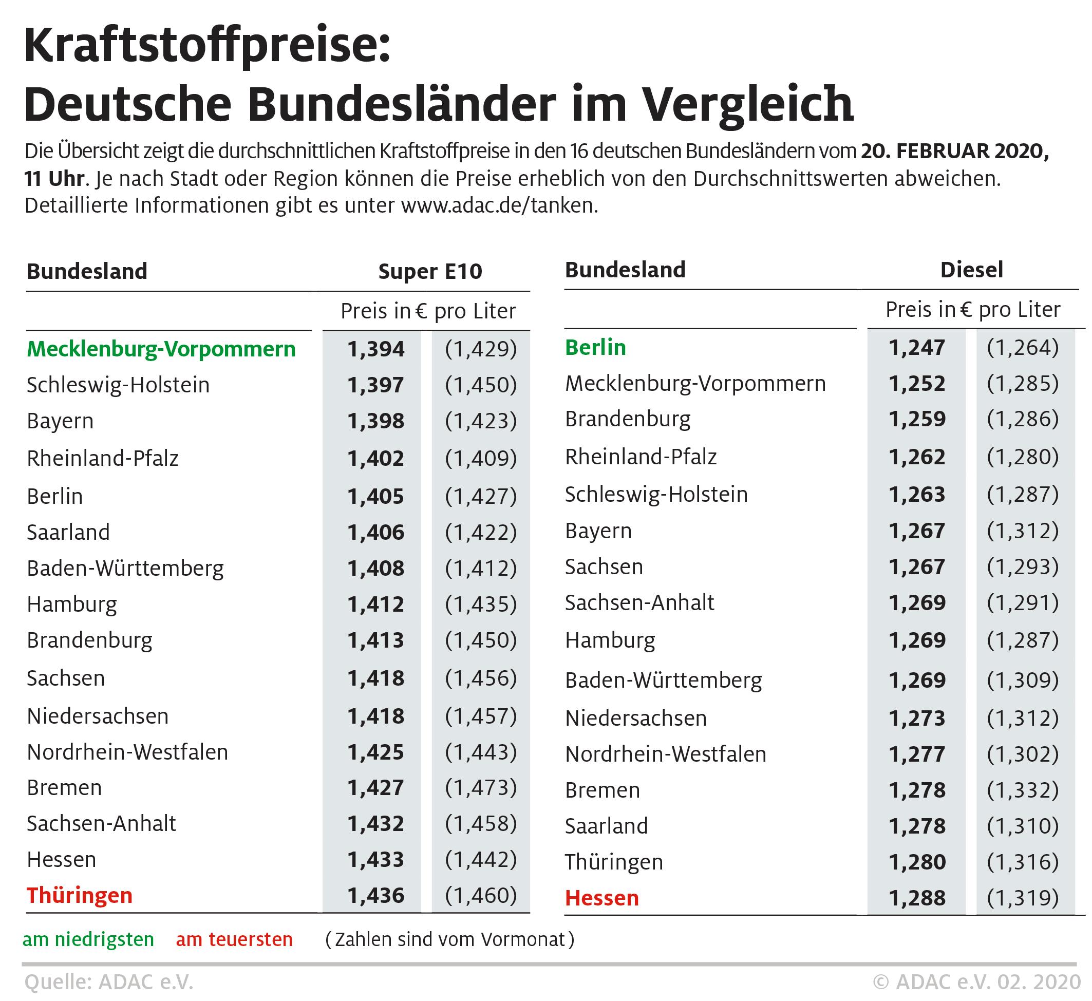 In der aktuellen Untersuchung hat der ADAC am heutigen Donnerstag um 11 Uhr die Preisdaten von mehr als 14.000 bei der Markttransparenzstelle erfassten Tankstellen ausgewertet und den Bundesländern zugeordnet. Die ermittelten Preise stellen eine Momentaufnahme dar. Unkomplizierte und schnelle Hilfe für preisbewusste Autofahrer bietet die Smartphone-App „ADAC Spritpreise“. Ausführliche Informationen rund um den Kraftstoffmarkt gibt es zudem unter www.adac.de/tanken.