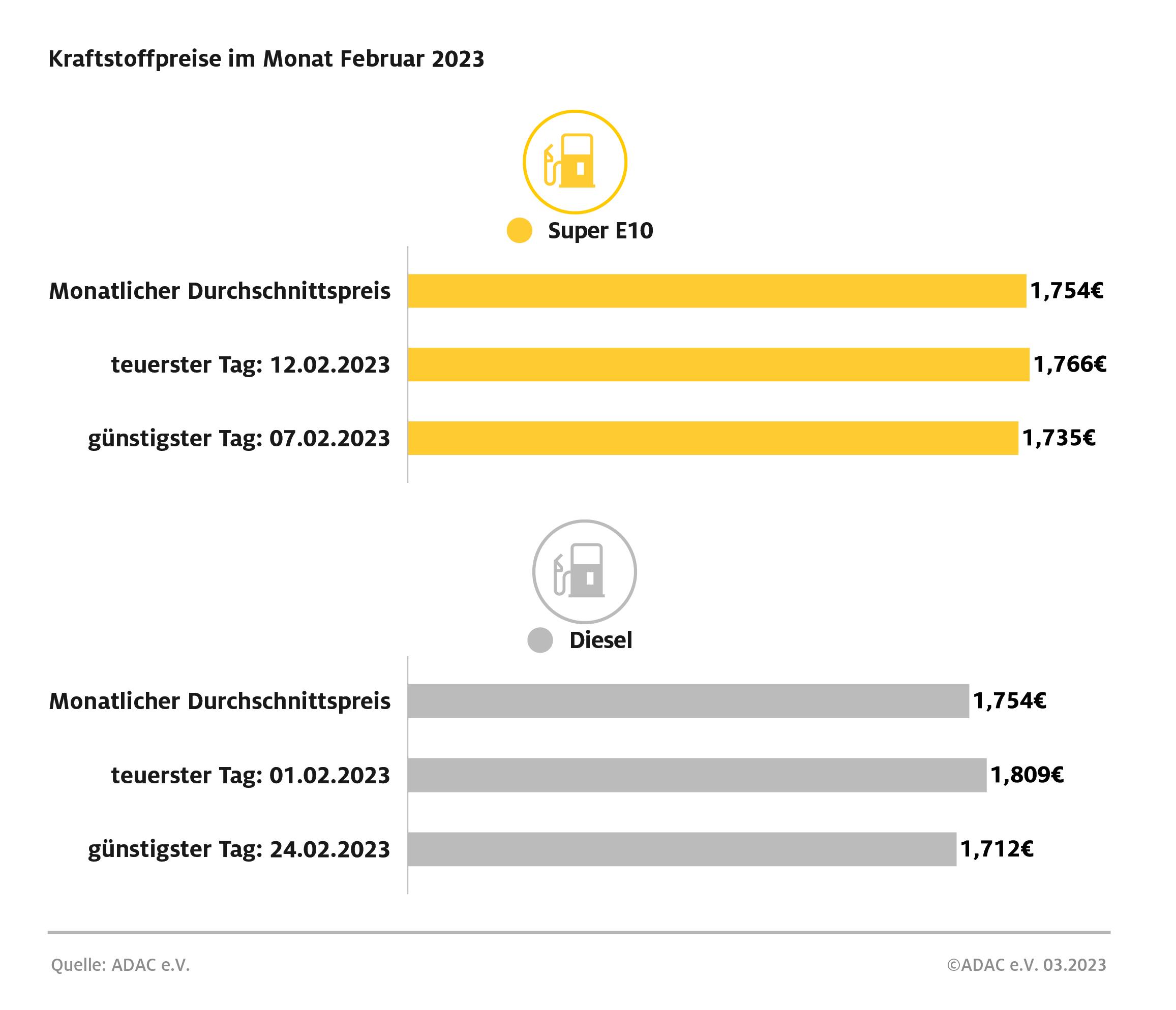 Die Unterschiede der Tagesdurchschnittspreise innerhalb des vergangenen Monats waren bei Benzin eher gering. Teuerster Tag zum Tanken war der 12. Februar mit 1,766 Euro je Liter Super E10, günstigster war der 7. Februar mit 1,735 Euro. Dass sich die Preise der beiden Kraftstoffsorten im Monatsmittel angeglichen haben, lag aber vor allem am deutlicheren Rückgang des Dieselpreises: Den höchsten Stand registrierte der ADAC am 1. Februar mit 1,809 Euro, den niedrigsten am 24. Februar mit 1,712 Euro. Bis einschließlich 13. Februar war Diesel teurer als Super E10, ab dem 14. Februar kehrte sich diese Relation nach über acht Monaten wieder um.