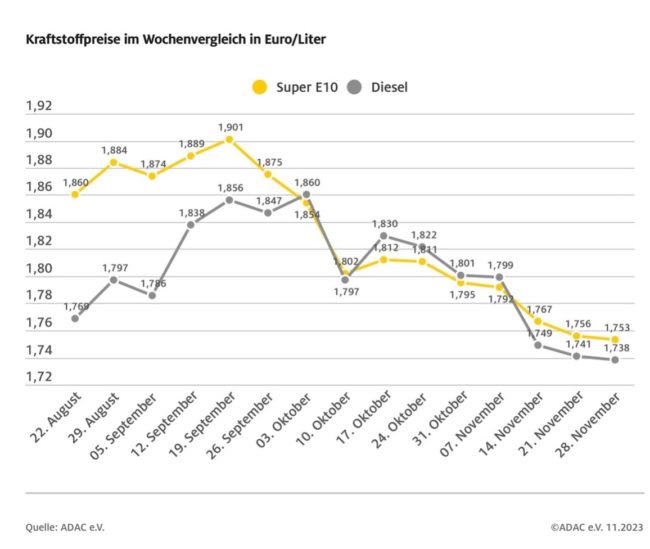 München (ots) Seit Mitte des Monats November haben sich die Kraftstoffpreise weiter stabilisiert, sie treten mehr oder weniger auf der Stelle. Das zeigt die aktuelle ADAC Auswertung der Kraftstoffpreise in Deutschland. Danach kostet ein Liter Super E10 im bundesweiten Schnitt 1,753 Euro – das sind 0,3 Cent weniger als vor einer Woche. Auch Diesel ist…