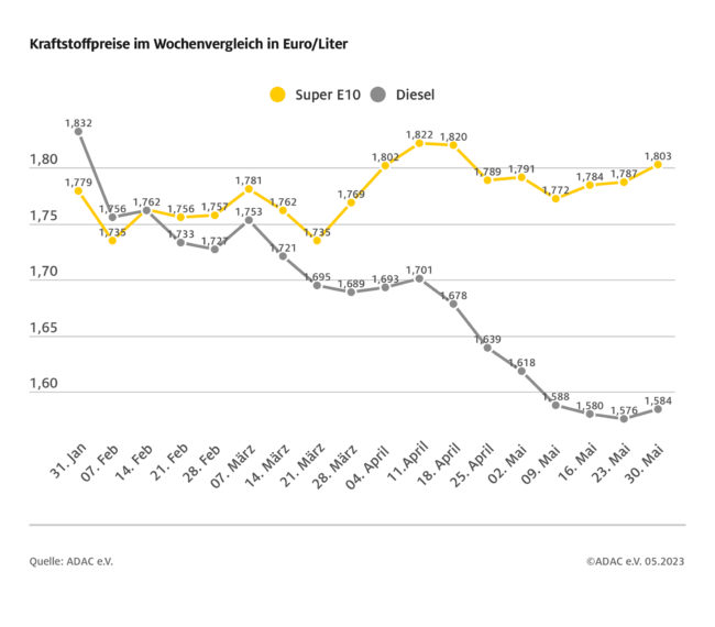 ADAC: Diesel im Mai 20 Cent billiger als Super E10 – Bislang günstigster Monat des Jahres für Diesel-Fahrer – Nur geringe Preisausschläge im vergangenen Monat