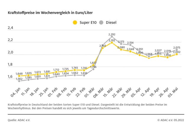 ADAC: Starker Preisanstieg an den Zapfsäulen – Beide Kraftstoffsorten kosten mehr als zwei Euro – Super E10 verteuert sich um 4,8 Cent, Diesel um 5,6 Cent
