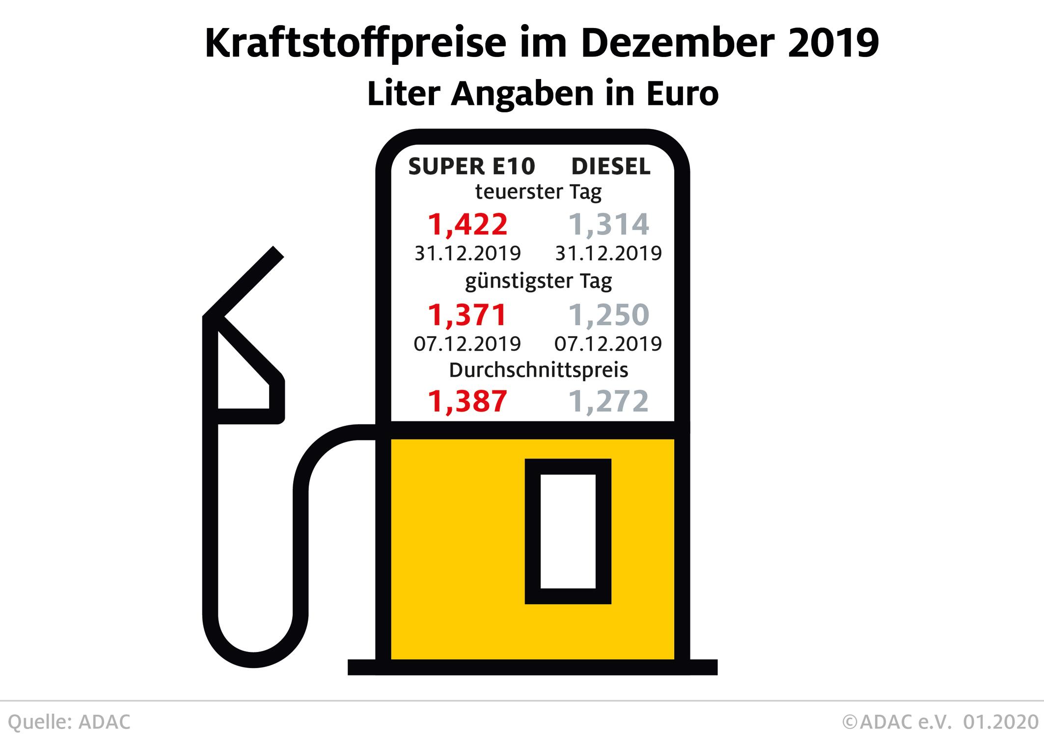 Für Autofahrer weniger erfreulich war die Preisentwicklung im Dezember. Wie die monatliche Marktauswertung des ADAC zeigt, kostete ein Liter Super E10 im bundesweiten Mittel im Dezember 1,387 Euro und damit 0,4 Cent mehr als im November. Für einen Liter Diesel mussten Autofahrer im Schnitt 1,272 Euro bezahlen, im Vormonat waren es noch 1,5 Cent weniger.