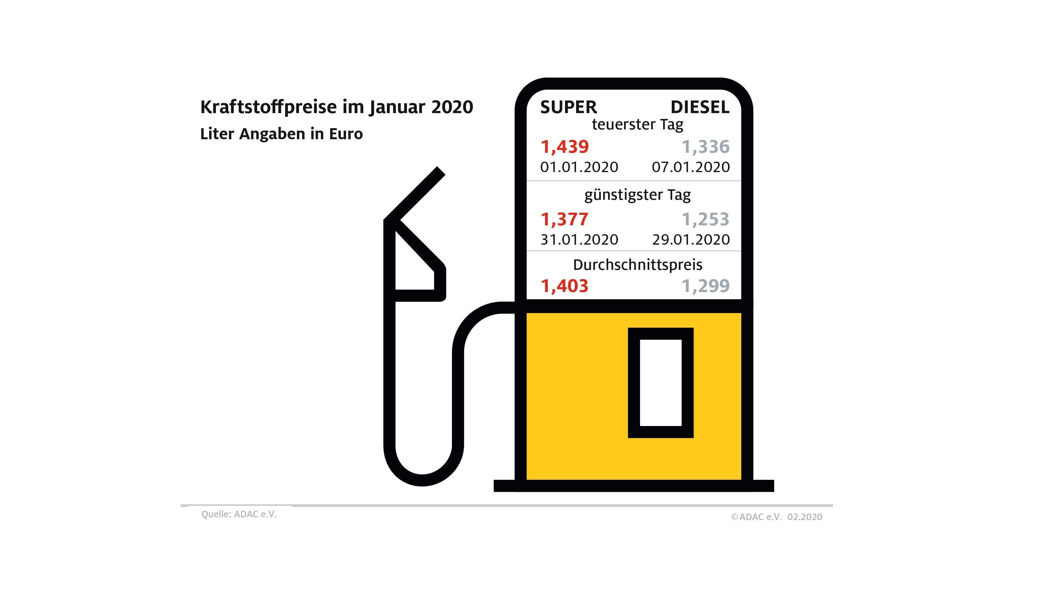 Autofahrer mussten im Januar für Benzin und Diesel im Bundesdurchschnitt mehr als im Dezember bezahlen. Laut der monatlichen Marktauswertung des ADAC kostete ein Liter Super E10 im Bundesmittel 1,403 Euro, das sind 1,6 Cent mehr als im Vormonat. Diesel verteuerte sich um 2,7 Cent auf durchschnittlich 1,299 Euro je Liter.