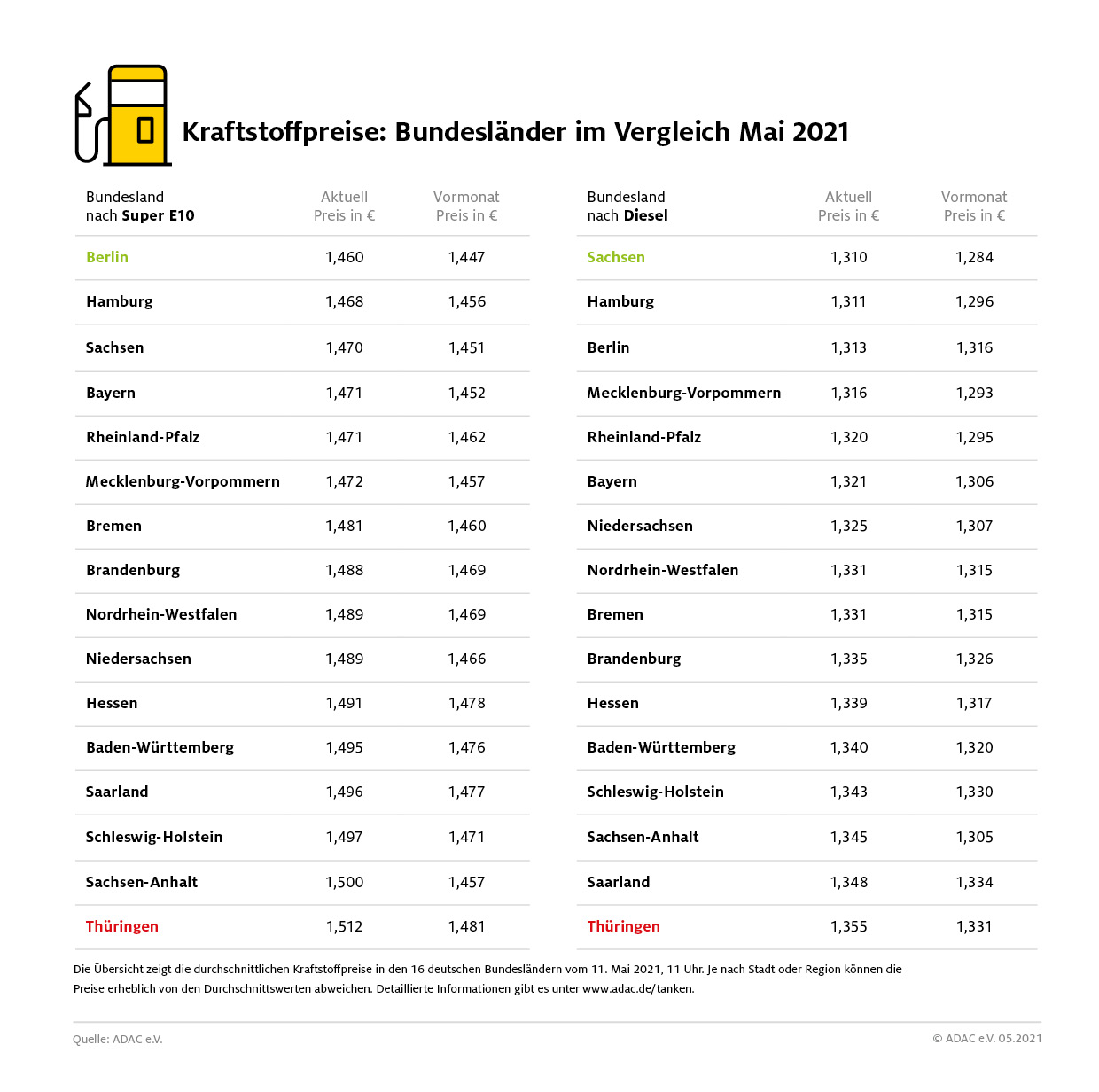 München (ots) – In Thüringen bleibt Sprit weiter teuer. Bereits in der letzten ADAC Auswertung der Kraftstoffpreise in den 16 Bundesländern rangierte Thüringen als teuerstes Bundesland. Auch diesmal hat Thüringen den negativen Spitzenplatz inne. Ein Liter Super E10 kostet hier 1,512 Euro und damit nochmal mehr als im Vormonat (1,481 Euro). Bei Diesel liegt der Literpreis bei 1,355 Euro ebenfalls höher als im April.