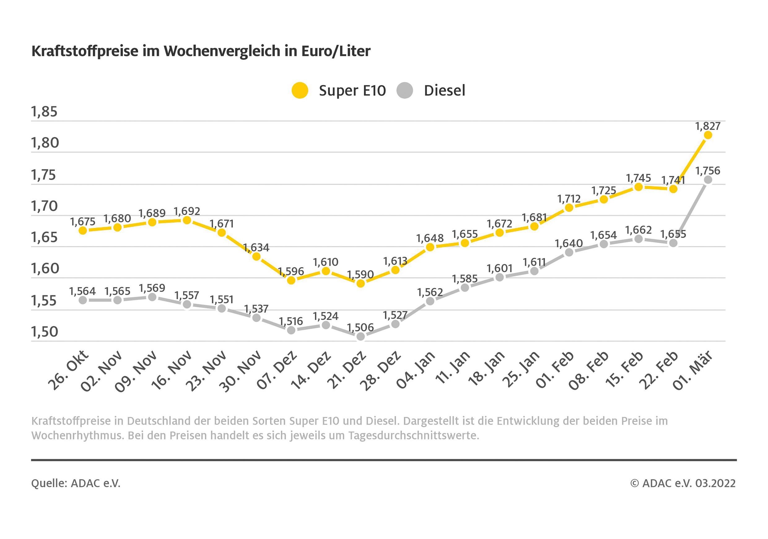München (ots) – Der Anstieg der Kraftstoffpreise setzt sich weiter fort. Vor dem Hintergrund des Krieges in der Ukraine und der wachsenden Nervosität am Rohölmarkt kommt es zu neuen Höchstständen an den Zapfsäulen. In seiner wöchentlichen Auswertung der Spritpreise ermittelt der ADAC bei beiden Kraftstoffen einen enormen Preissprung im Vergleich zur Vorwoche.