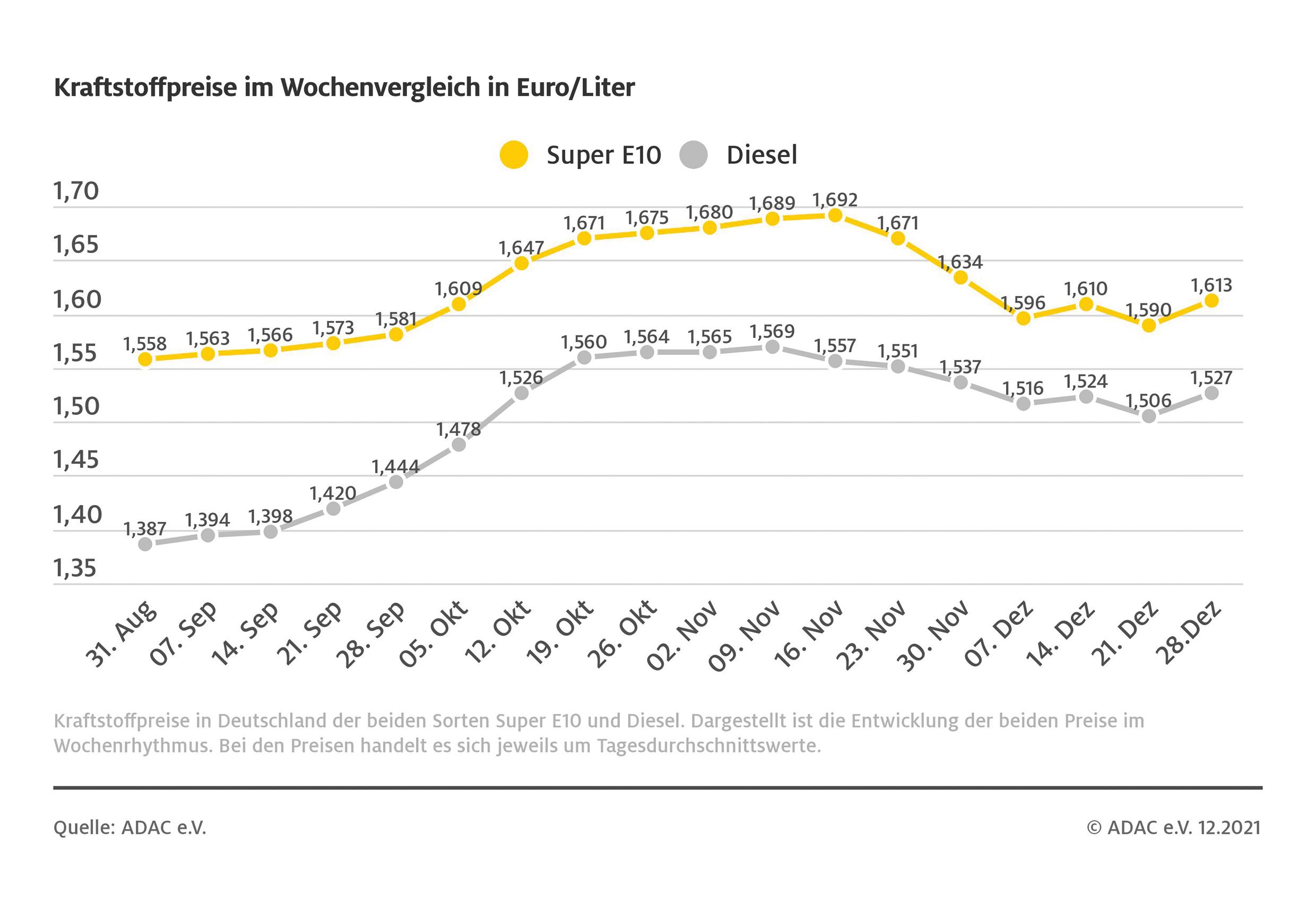 München (ots) – Zum Ende des Jahres müssen Autofahrer beim Tanken noch einmal tiefer in die Tasche greifen. Laut aktueller ADAC Auswertung der Kraftstoffpreise kletterte der Preis für einen Liter Super E10 im Vergleich zur Vorwoche um 2,3 Cent und liegt derzeit im bundesweiten Mittel bei 1,613 Euro. Diesel kostet im Schnitt 1,527 Euro, das ist ein Anstieg von 2,1 Cent.